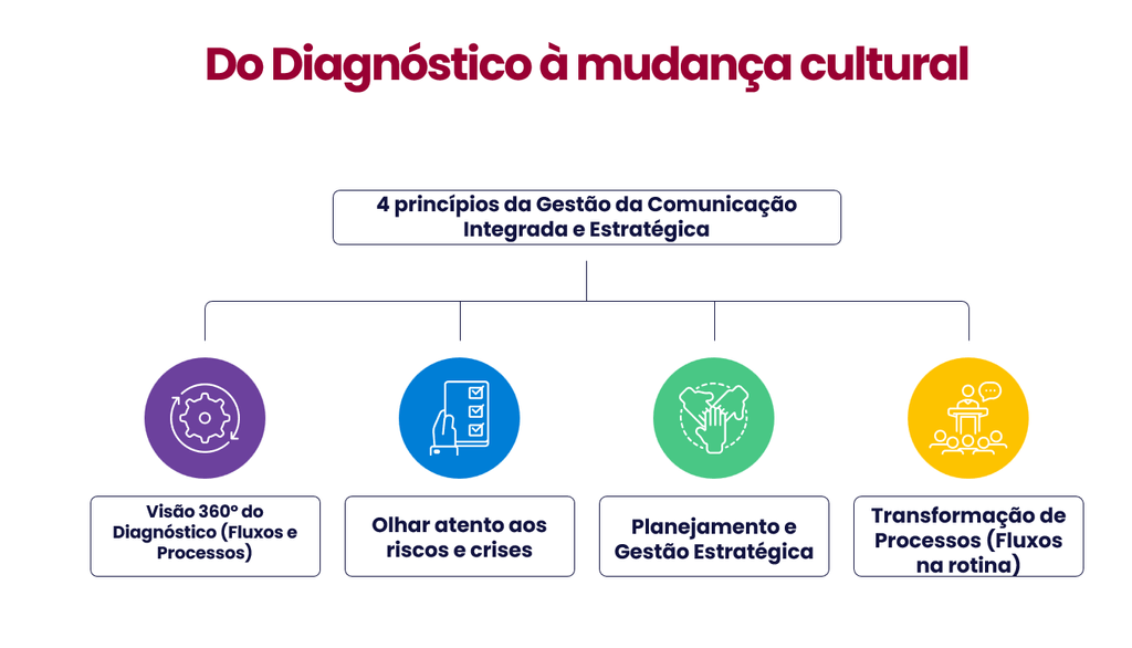 Dessa maneira, além do diagnóstico de comunicação, é essencial entender que a gestão é um ciclo completo, que se inicia com as primeiras auditorias de canais, cultura, reputação, liderança, processos e vai até a implementação do planejado e acompanhamento das estratégias no cotidiano, por meio de indicadores de desempenho.