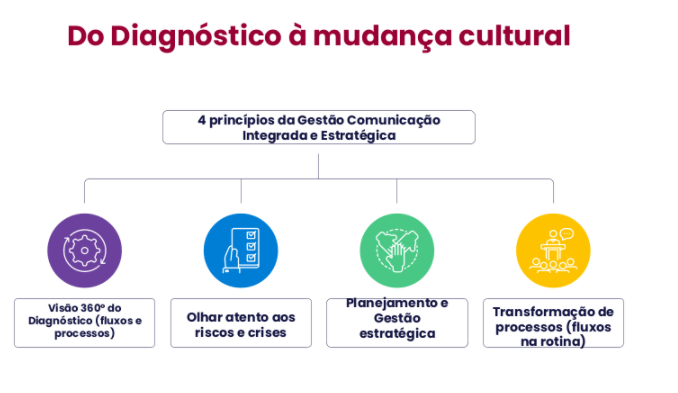 Mas, precisamos de cuidado: não adianta ter um plano integrado de comunicação que desconsidera a estratégia no cotidiano, pessoas, processos e os fluxos na rotina. Veja, em nosso fluxograma, as premissas e princípios para um trabalho alinhado à cultura organizacional.